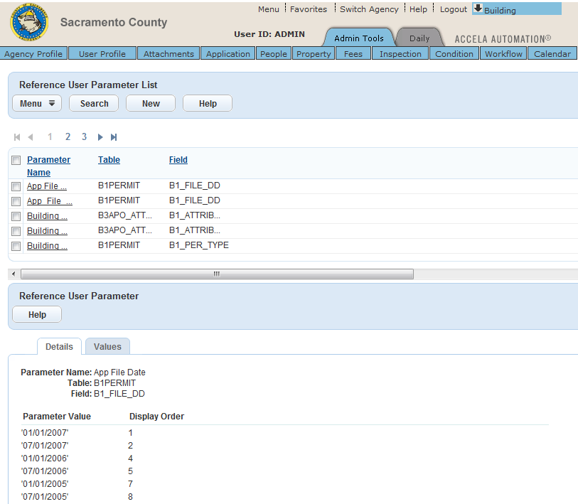Civic Platform displays the Reference User Parameter List page.
