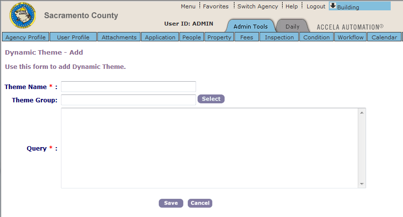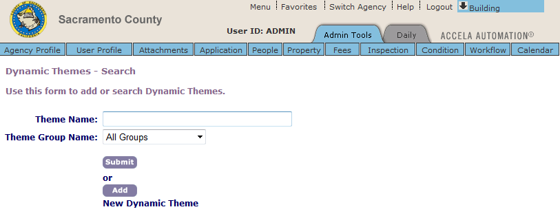 Civic Platform allows you to edit a dynamic theme. Possible values that you can edit include the theme group, the user parameters, the query, and the status of the query.