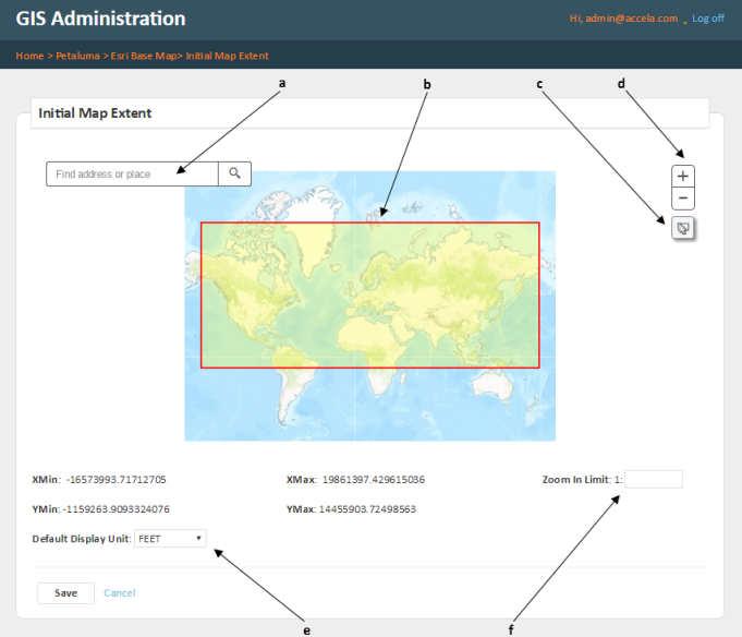 e: Set the map display unit. This is useful for different map services that require different types of map projections. For example, the Universal Transverse Mercator linear data unit is in meters while the California State Plane linear data unit is in feet. The GIS Administrator can decide which unit is more applicable to the map users. The map scale will automatically adjust to the selected display unit.