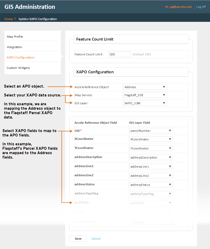 Civic Platform can integrate with an external address, parcel, and owner (XAPO) data source. Accela GIS supports the mapping of reference object and custom fields between Civic Platform and an XAPO data source via the agency's map service. Accela GIS supports XAPO integration with map services provided by ArcGIS Server and ArcGIS Online.